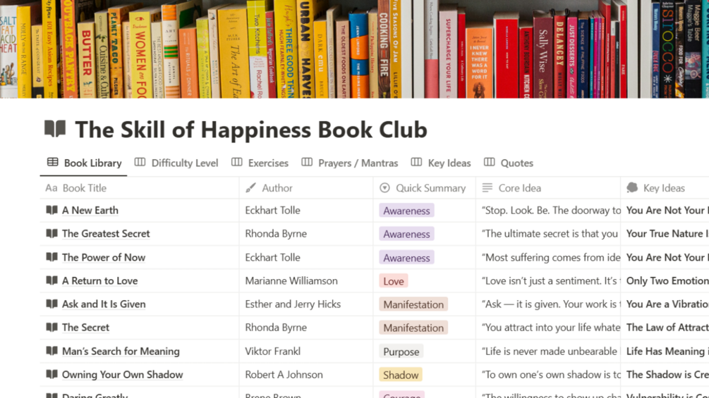 This Notion template is a curated library of 15 hand-picked books that explore happiness from every angle—philosophical, spiritual, psychological, and practical.