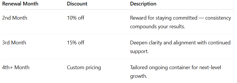 Most of my clients need more than one month of coaching. Personally, I feel the longer you're in coaching, the more exponential returns you see on your investment. To make renewal more accessible, I offer renewal rewards.
