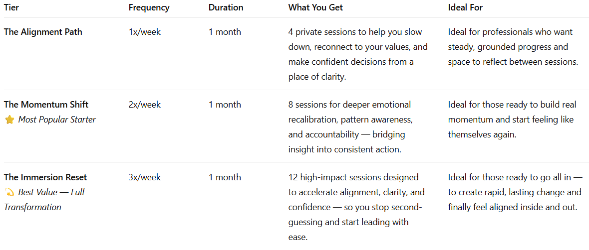 - Built for reflection, not reaction: Traditional coaching thrives on immediacy. My coaching thrives on depth.